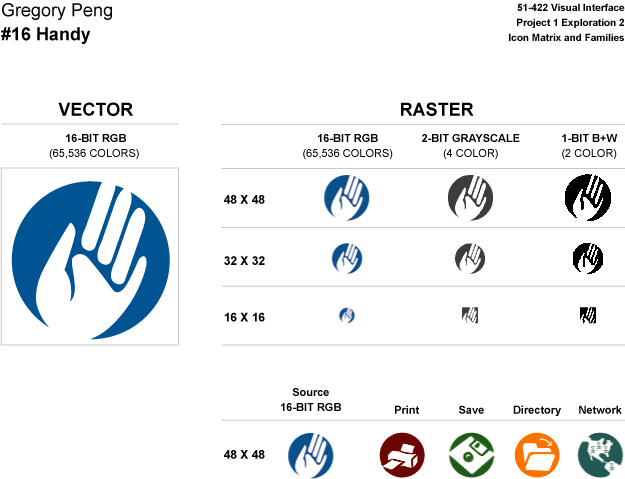 Icon Matrix and Families Spring 2007, Visual Interface Design Starting with a stock example of an icon, we were given the task of redesigning the same icon for different specifications. Moreover, following the same look and feel of the original icon, we designed four additional icons which could be considered part of the same family. Of course, this wasn't exactly a walk in the park. As pixel counts decrease, it becomes increasingly harder to convey ideas. As always, the download's to the right -> |
